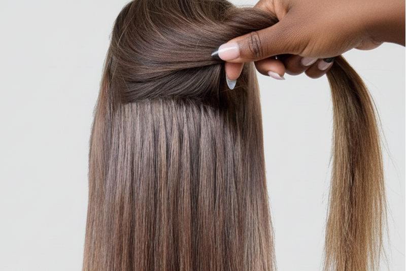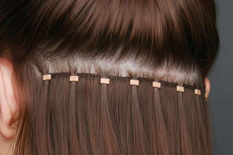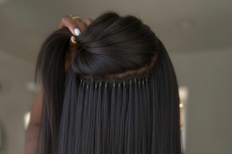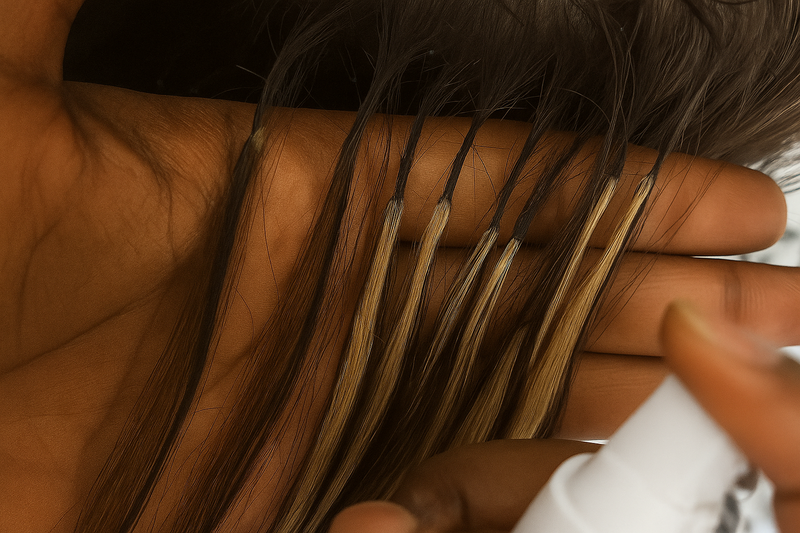 This hidden-bead technique offers maximum versatility and an invisible finish. Service includes up to 4 rows of wefted hair (up to 20”). Additional cost applies for lengths 22” and above. Consultation required prior to booking.